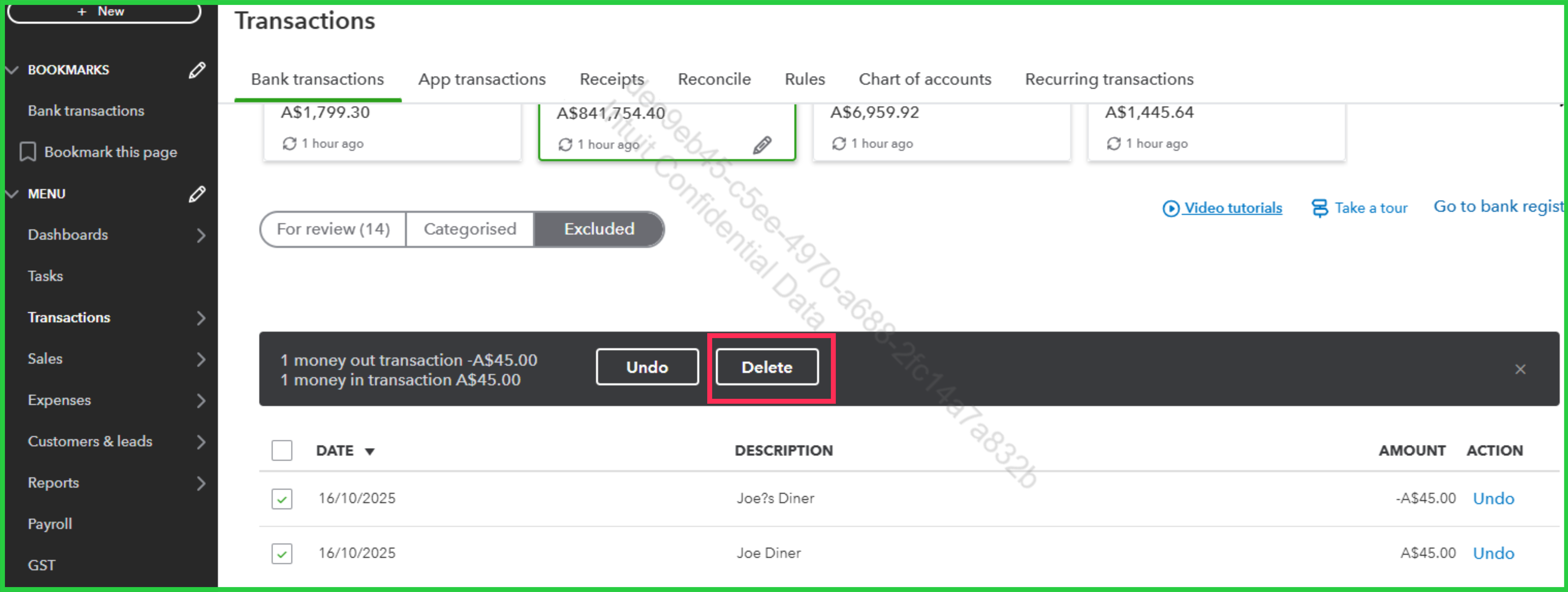 Please note that directly deleting duplicate transactions without first excluding them will cause the system to recognise them as missing and re-download them from the bank. Deleting duplicates through the Excluded tab prevents QuickBooks from re-importing these transactions into the bank feed.