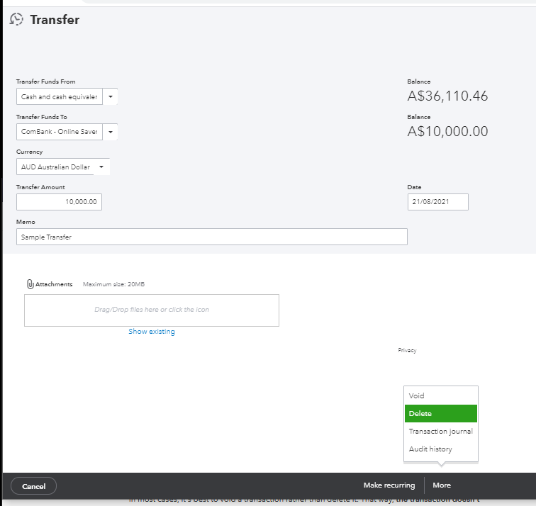 However, if there are no other transfers added, go back to your bank register and press the F5 key on your keyboard to refresh the page. If you're still getting the same result, we can do some of the basic troubleshooting steps.