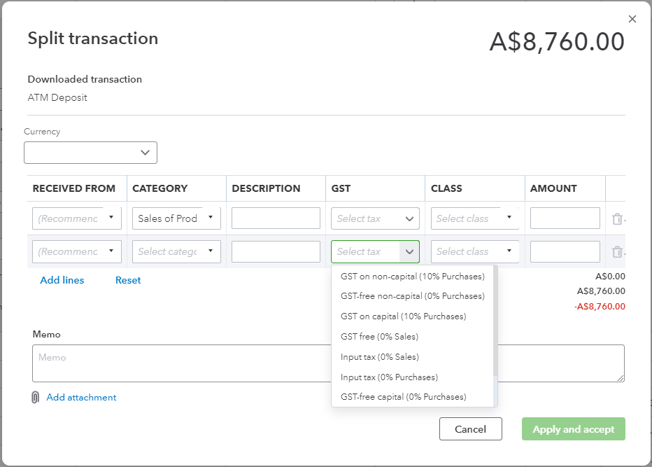 Im am have problems with bank feeds when i split them, i can not choose the GST type ? ant ideas please
