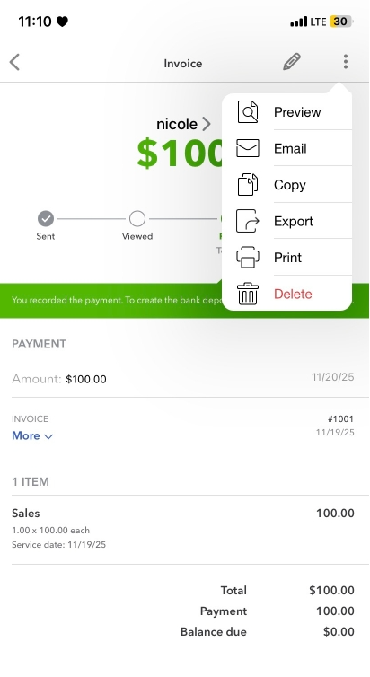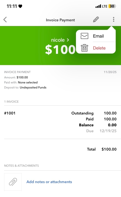 You can send you customer their receipt of payment through email in the QuickBooks app. There are two options on how you can email it by using the sales invoice page and utilizing the invoice payment feature.