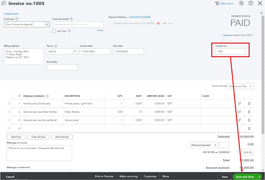 - Update the invoice number, then hit Save and close.