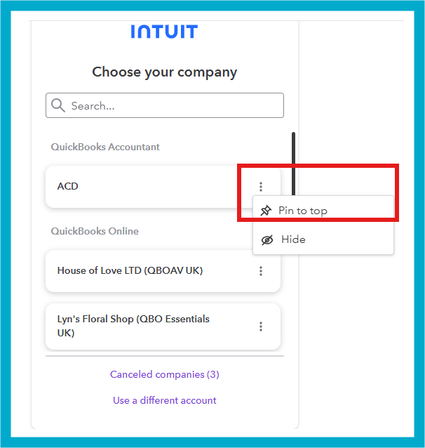 Before we proceed, please know that we cannot delete a QBOA account because they're tied to your Intuit profile and used for managing client books. It's also a free account and doesn't require a subscription. As a workaround, you can Pin those QBOA accounts you are using.
