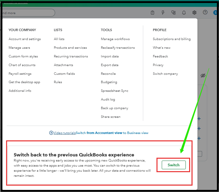 Then, locate and click the Switch back to the previous QuickBooks experience option below.