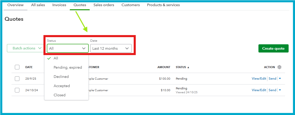 While this is not currently an option in QuickBooks Online (QBO), there are two effective methods for managing and hiding old quotes.