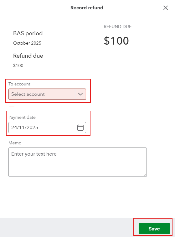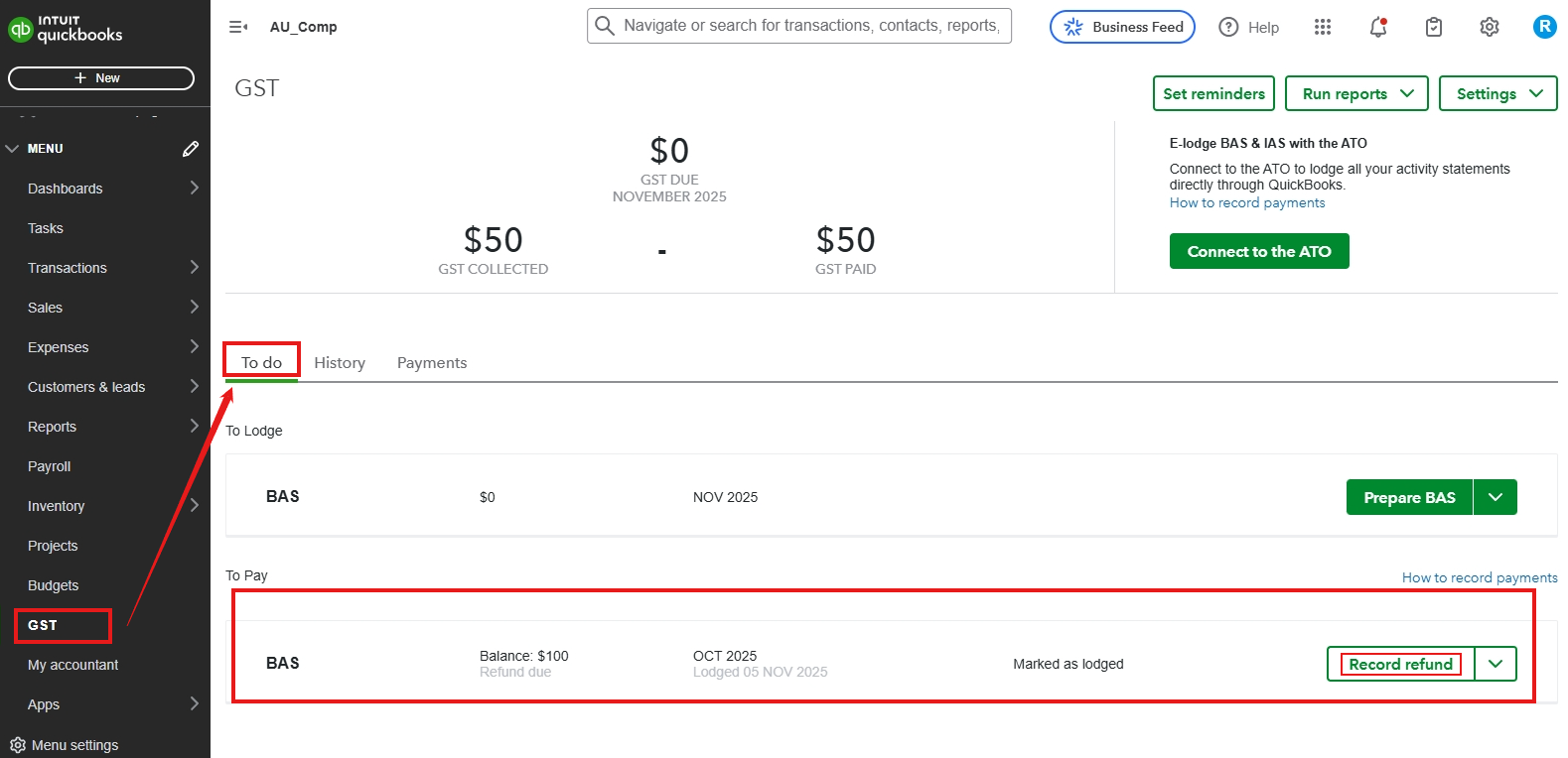 If you lodge BAS inside QuickBooks, there's an option to record the refund directly.
