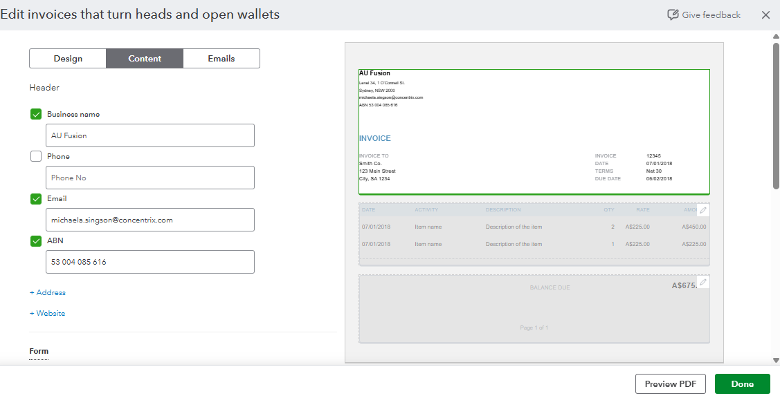 - Underneath the Header section, ensure ABN is ticked.