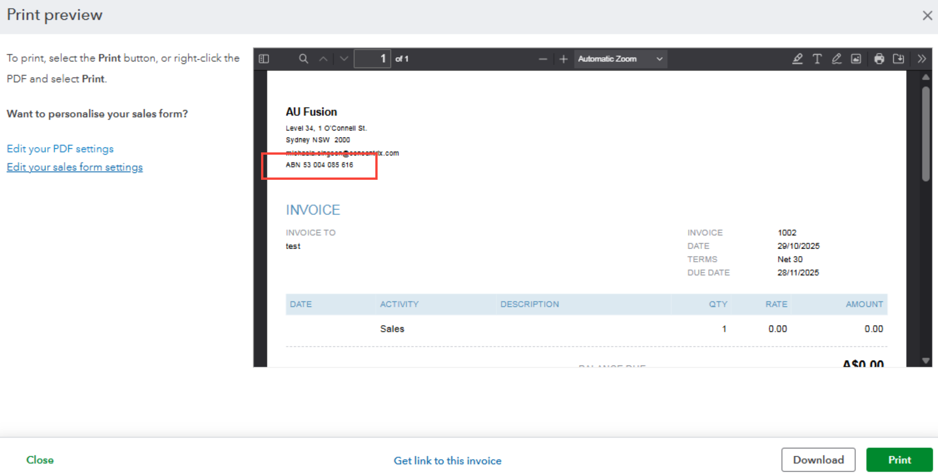 Please note that the ABN will automatically appear on all invoices and quotes only when you send, print, preview, or download the PDF file.