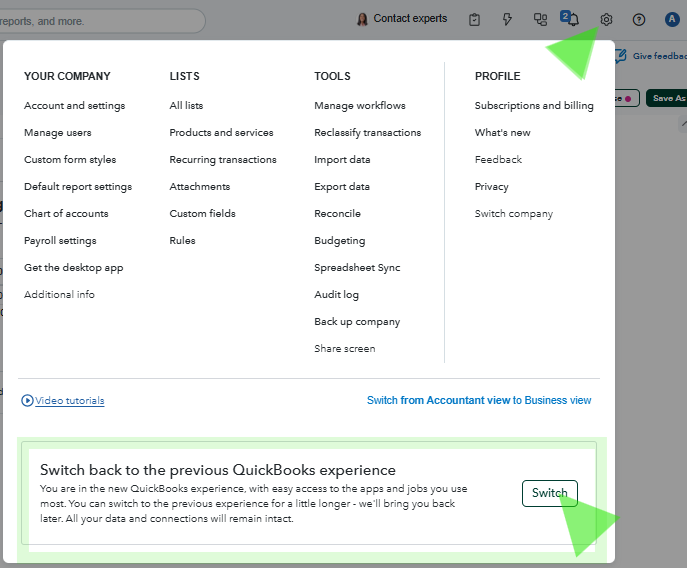 If you would like to switch the entire QuickBooks interface back to the previous experience, click the Gear icon and select the Switch button within the Switch back to the previous QuickBooks experience box.