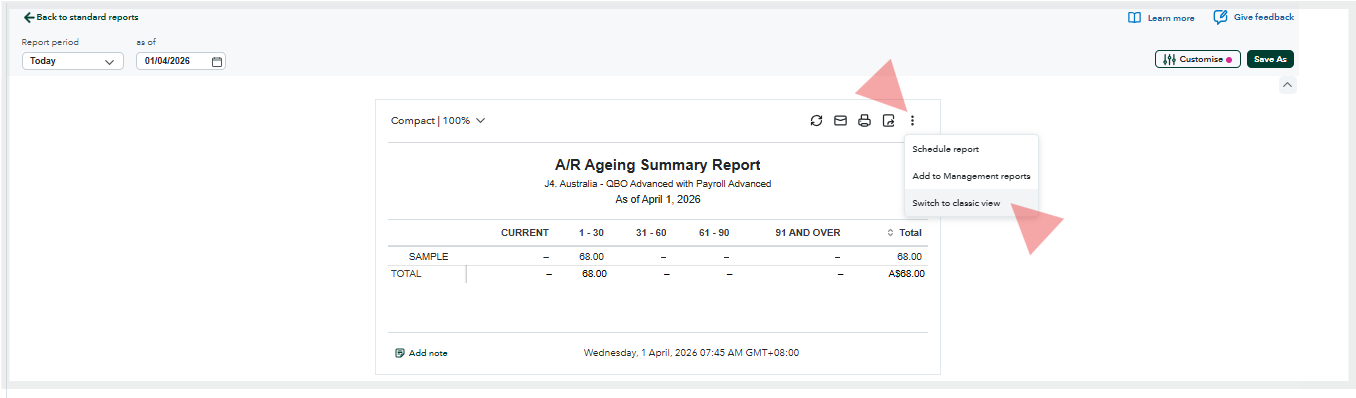 Hello there, @j-casson. If you are looking to use the Classic View for your reports, navigate to the Reports menu and click the vertical ellipsis (three dots) to select Switch to Classic View. This will revert the report to the previous interface. Keep in mind that this option is only available for certain reports.