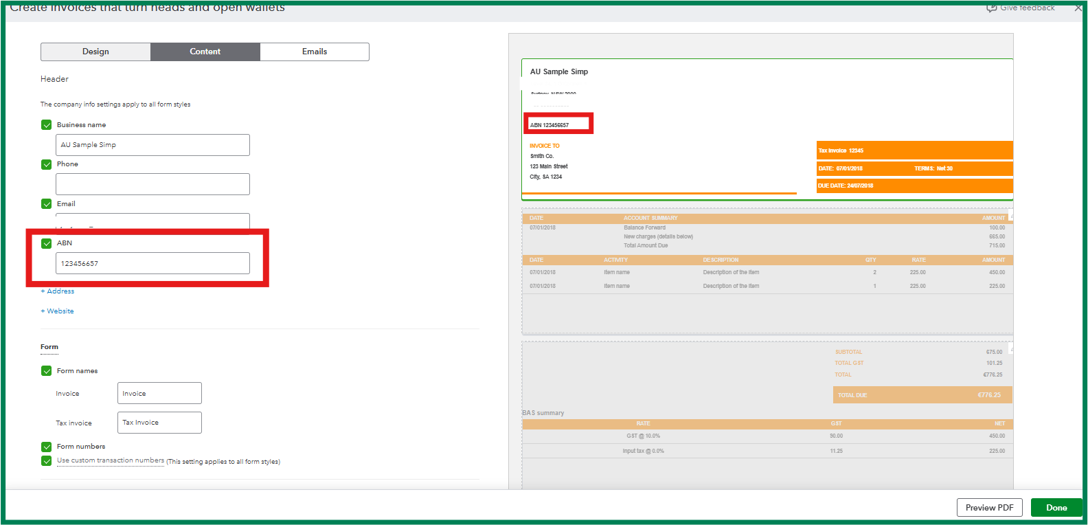 5. In the Header section, ensure the ABN checkbox is marked as checked.