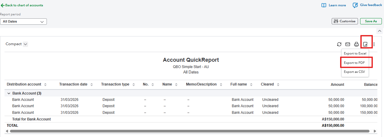 Exporting the company's transaction list to PDF is straightforward and can be done using the reports. You can generate a report by navigating through the Chart of Accounts. Here's how: