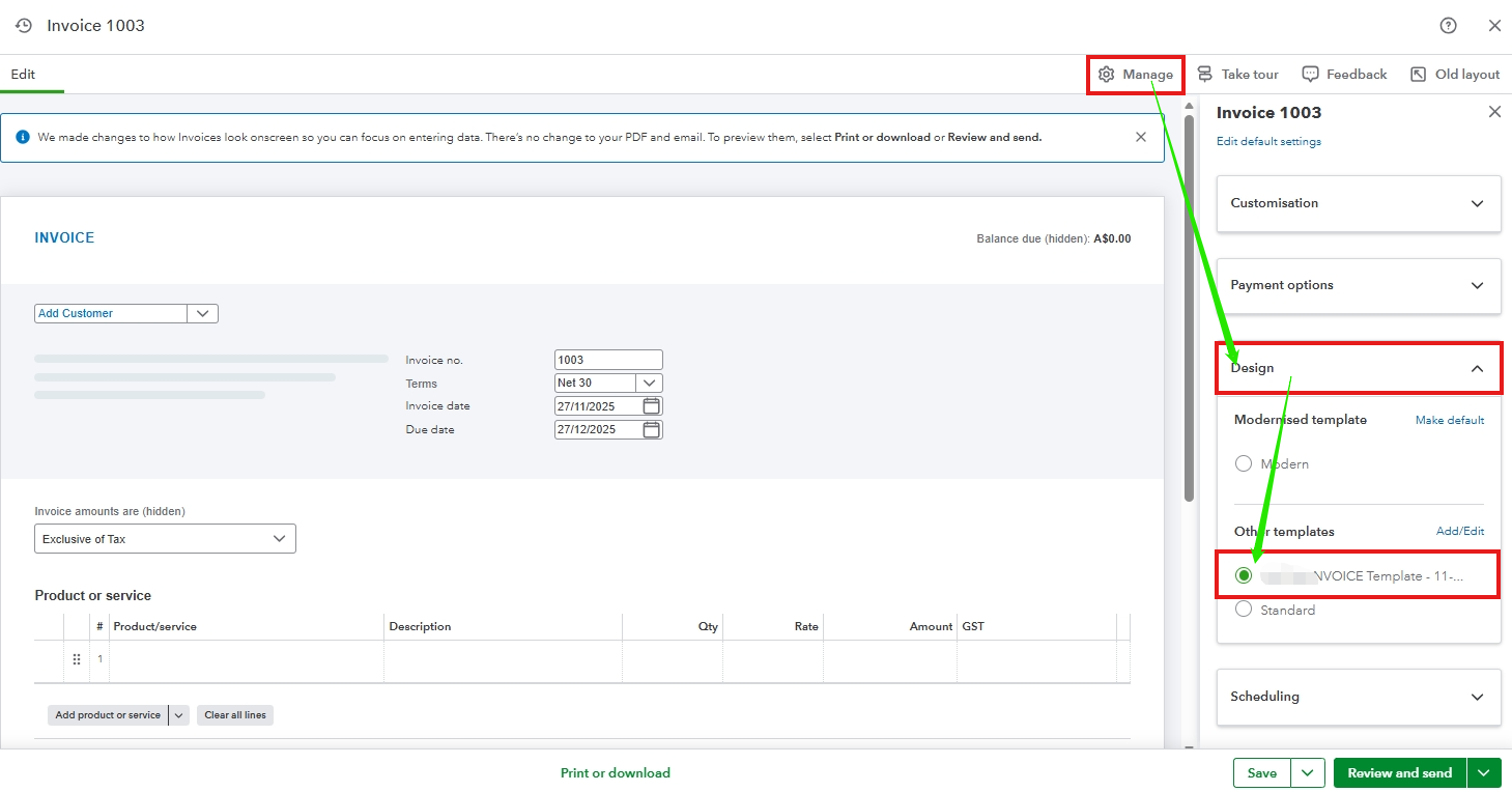 Once done, let's create a new invoice to test it out. If the layout remains unchanged and the payment details are still missing, it is likely that the invoice design has changed to Modern due to the transition from the old layout to the new one. The new invoice layout utilizes the Modern template, which may override the payment details you previously added.
