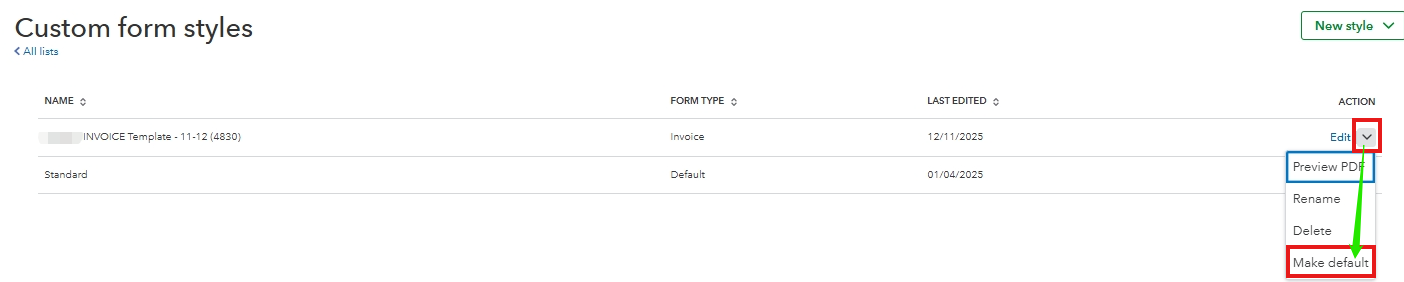 If the previous invoice layout, which included your payment details, is a customized template, follow these steps to verify and make it as default: