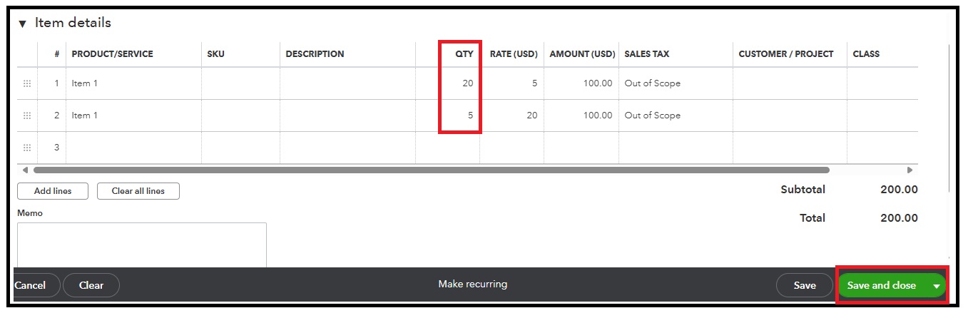 - Change the quantity or amount for each line item to reflect the portion you received or plan to pay for.