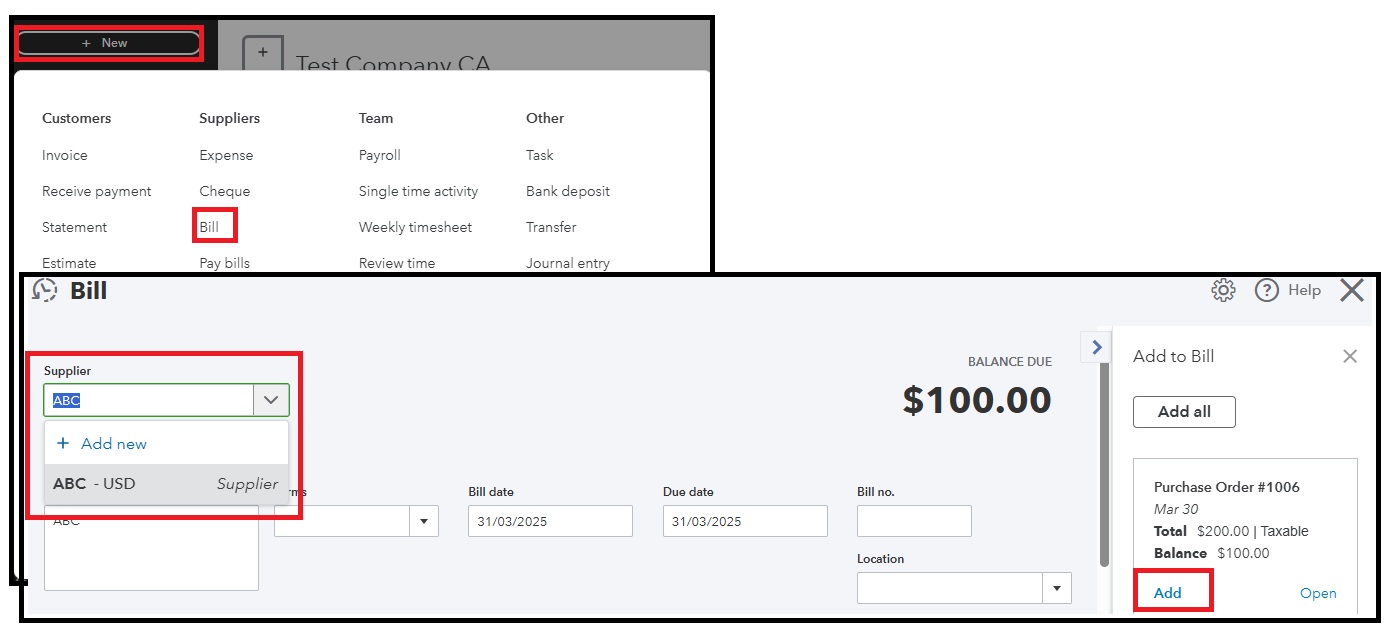 - Select + New, then Bill.