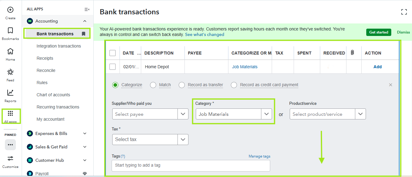 - Under Accounting, choose Bank transactions.