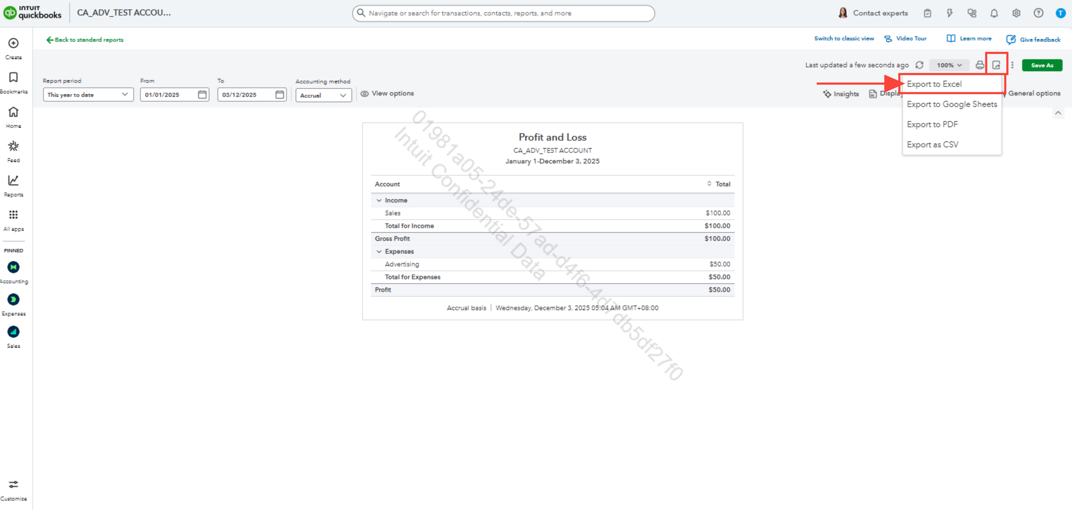 - Dans Rapports, accédez au rapport Profit et Loss.