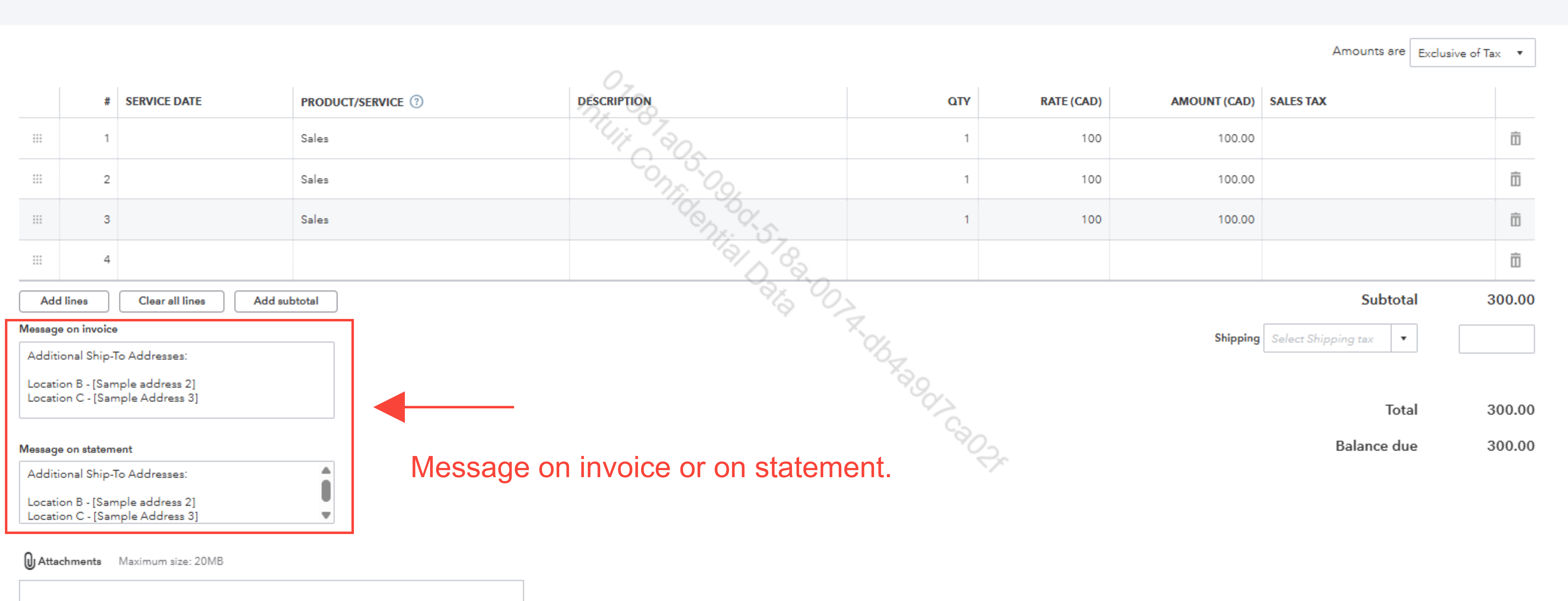- Scroll down to Message on Invoice or Message on Statement field and input any additional shipping addresses.