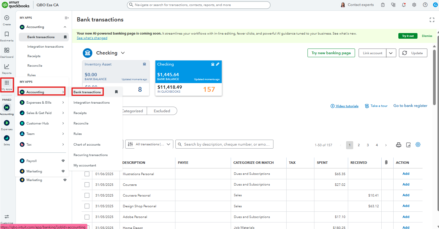 - Find Bank transactions and click the dropdown arrow beside the Link account button.
