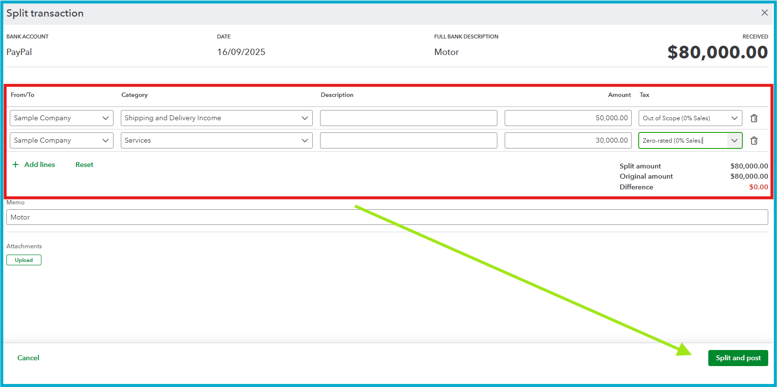 - Allocate amounts for each category until the Difference shows CA$0 ( I use a sample transaction only).