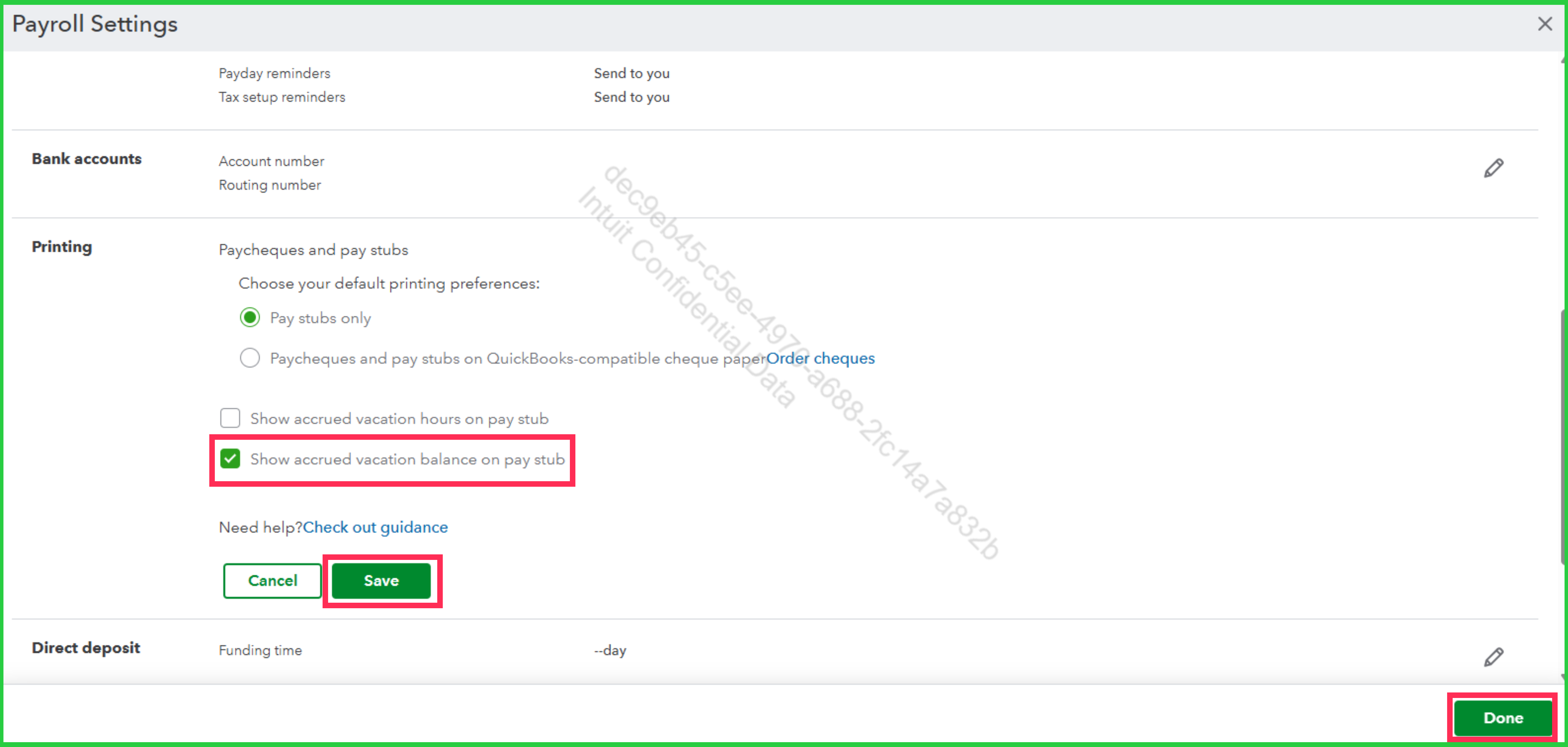 To show the balance on pay stubs, go to Payroll Settings, then click the pencil icon in the Printing section. Then, enable Show accrued vacation balance on pay stub, then click Save and Done.