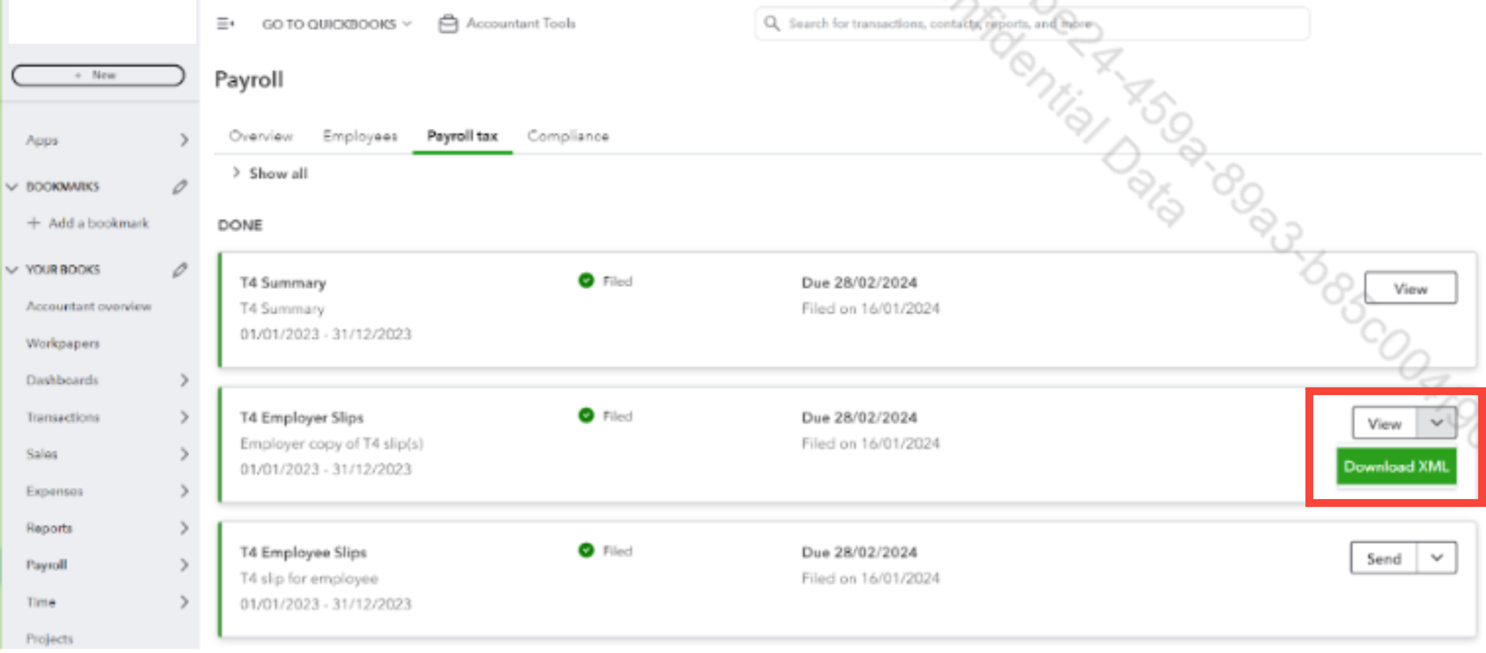 Thank you for reaching out, Dean. I’d be happy to guide you on how to get a copy of your T4 XML in QuickBooks Online Payroll. You can download it directly from the PayrollTaxCentre.