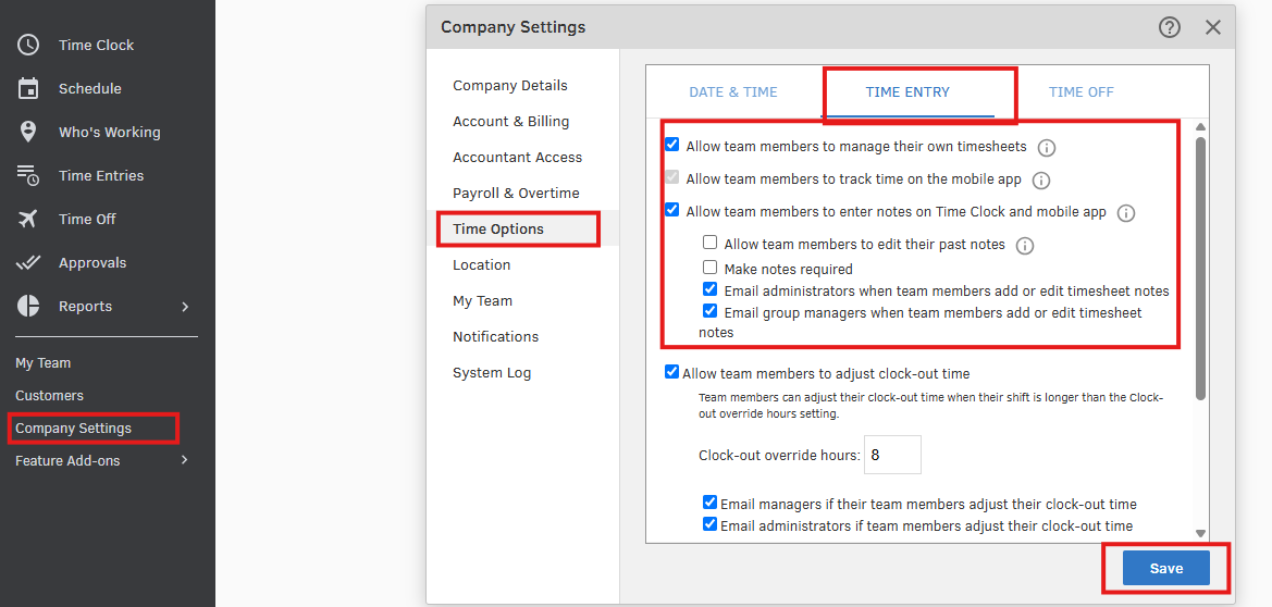 - To allow all team members to sign in from anywhere (computer or mobile) and manage their own timesheets: Select Allow team members to manage their own timesheets, then Save. By default, this turns on the mobile time entry permission (and greys it out) both in company settings and individual team member permissions. If needed, you can customize mobile time entry for individual team members.