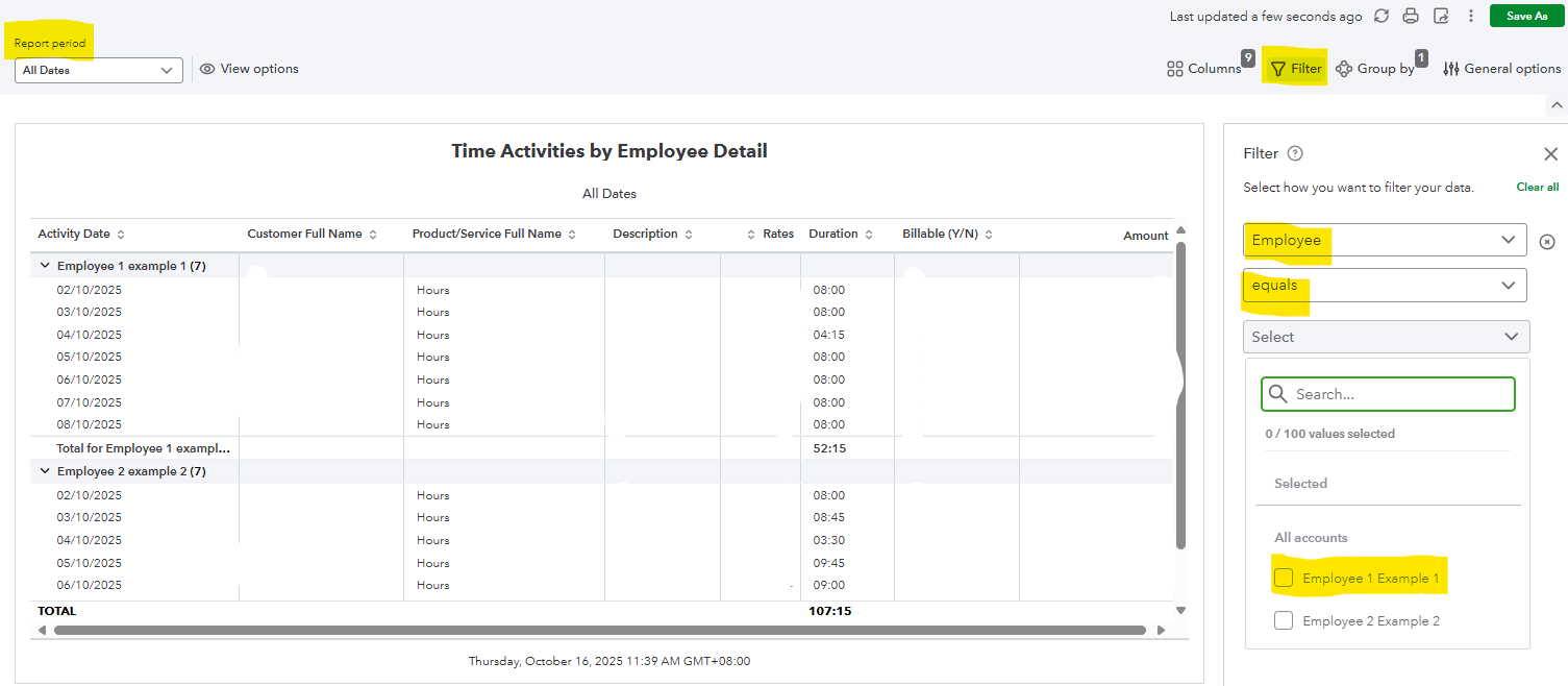 4. In the Filter section, choose Employee, Equals, then the name of your employee.