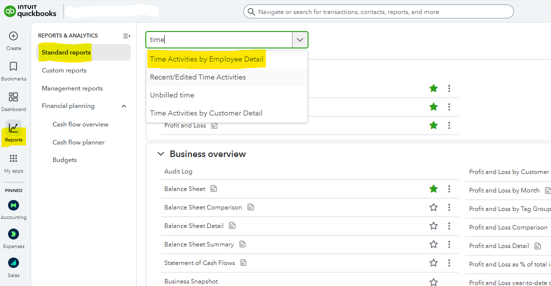 2. Type Time Activities by Employee Detail report in the Search bar.