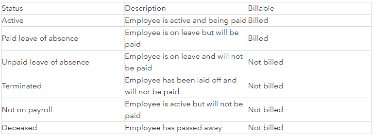 Moving forward, be sure to update the status of any employee you do not want to be billed for by marking them as Terminated, Unpaid leave of absence, Not on payroll, or Deceased. Please refer to the attached screenshot for detailed information on the different employee statuses and which ones incur billing charges.