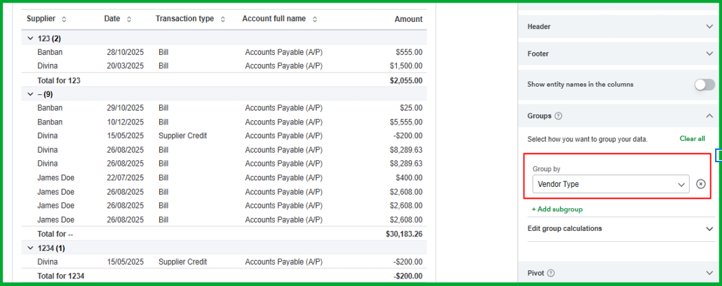 - Use the Group By field to sort transactions by Vendor Type so payables are organized accordingly.
