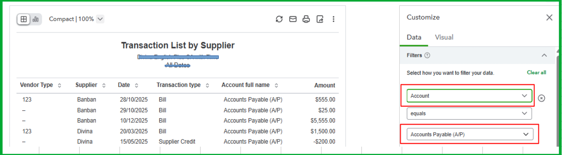 - Go to the Filters section, select Account in the dropdown, and then choose Accounts Payable (A/P) in the next dropdown.