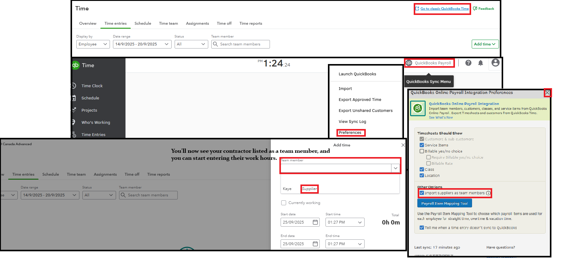 To track time for your contractor/supplier, update your QuickBooks Time settings to import them as team members. It will allow contractors to appear in your time tracking list, @audrey37.