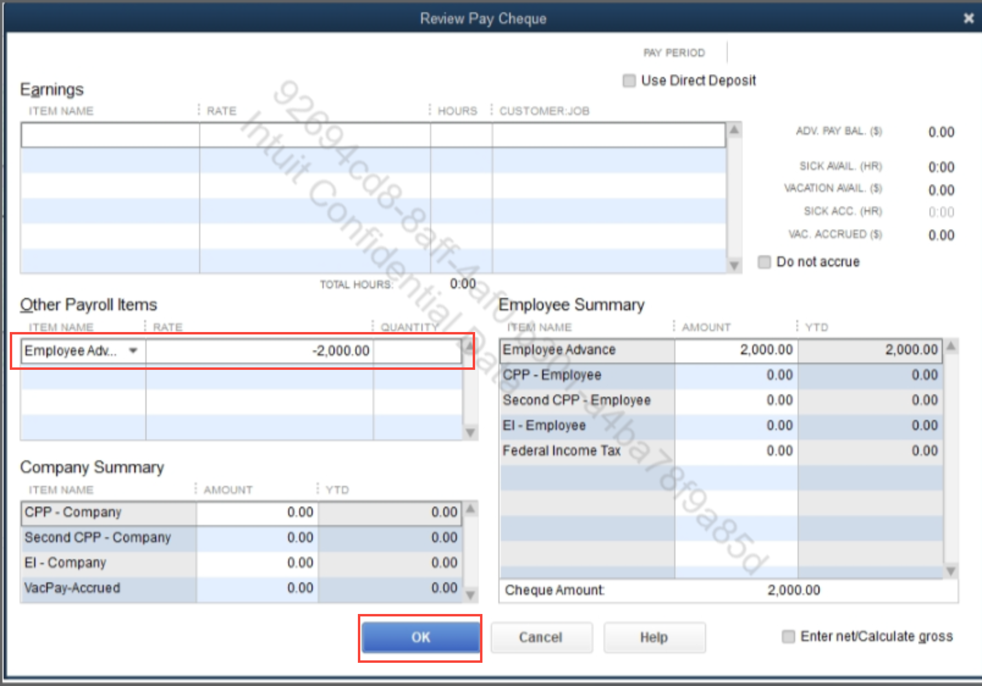 - On the Advance item, enter the amount with a minus sign (-) and click OK.