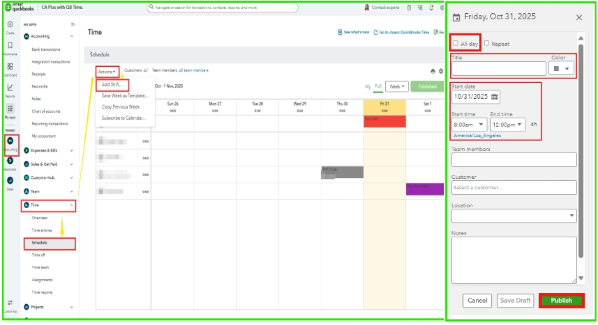 In QuickBooks Time (QBO Time), there isn’t an option to directly copy a single shift to another day. Currently, the feature only allows copying the entire previous week’s schedule, not individual shifts. To replicate a single shift on another day, you'll need to manually add a new shift with the same details. You can do this by selecting Schedule, then clicking Actions, followed by Add Shift, and entering the shift information.