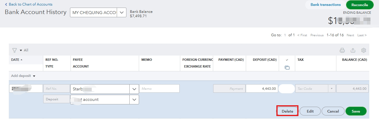 4. Locate the two transactions showing as deposits in the Bank Account History.