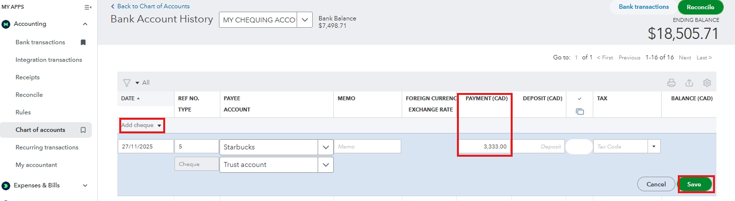 After that, recreate the Cheque transactions and ensure the amounts are entered on the Payment field.