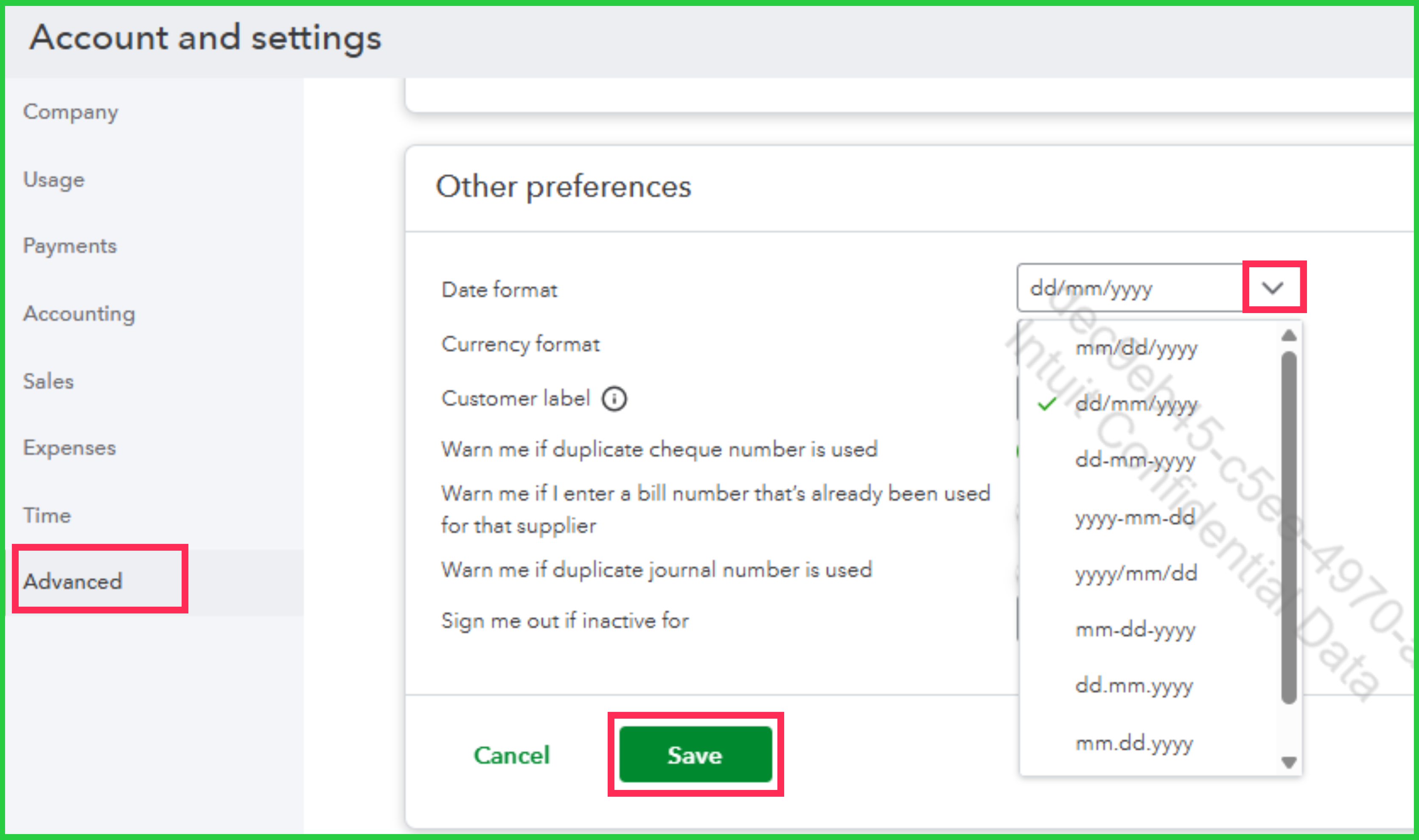 You can change the document date format in QuickBooks by going to the Advanced tab in Account and settings. Here's how: