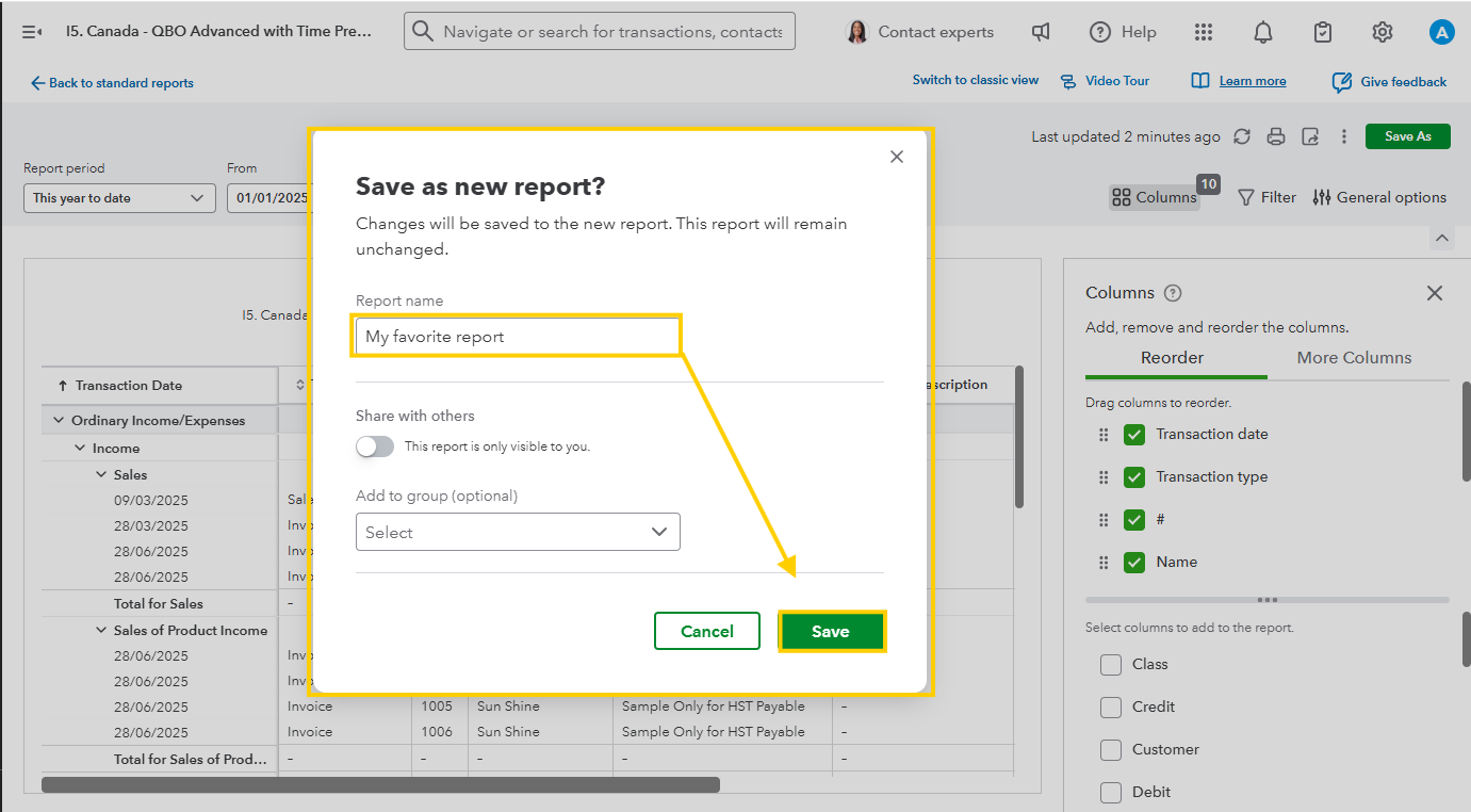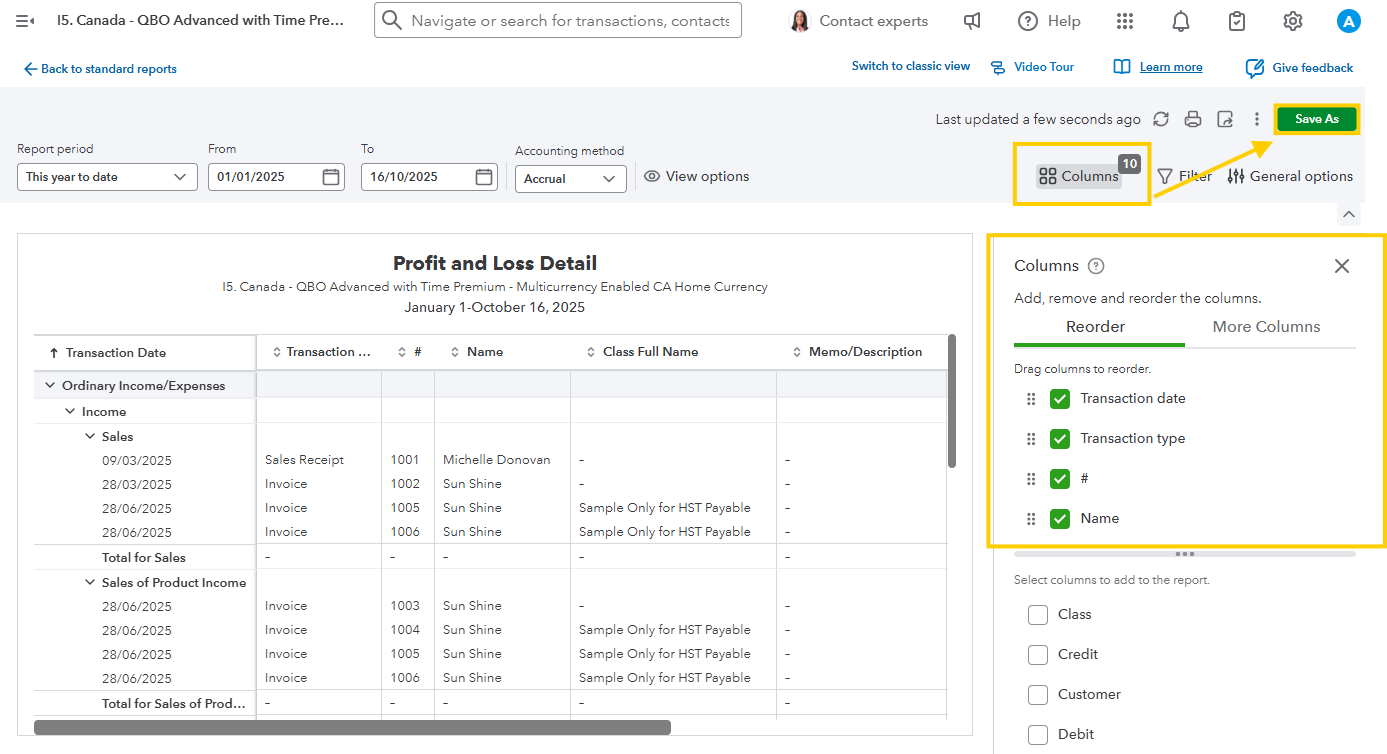 Pour des zones comme le Plan comptable (Chart of Accounts), votre liste de transactions de vente (Sales transactions), de Dépenses (Expense) ou de Factures (Invoice), QBO ne mémorise que le dernier filtre que vous avez défini. Il se base sur les colonnes que vous choisissez d'afficher.