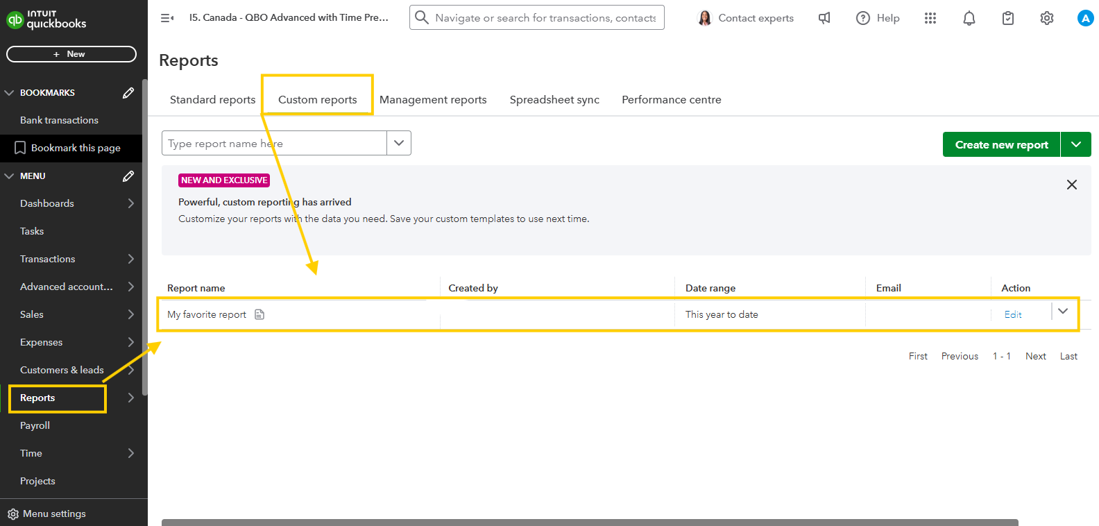 Maintenant, chaque fois que vous avez besoin de ce rapport avec vos colonnes personnalisées, n'exécutez pas le rapport standard! À la place, allez à la section Rapports (Reports) et ouvrez l'onglet Rapports personnalisés (Custom Reports).
