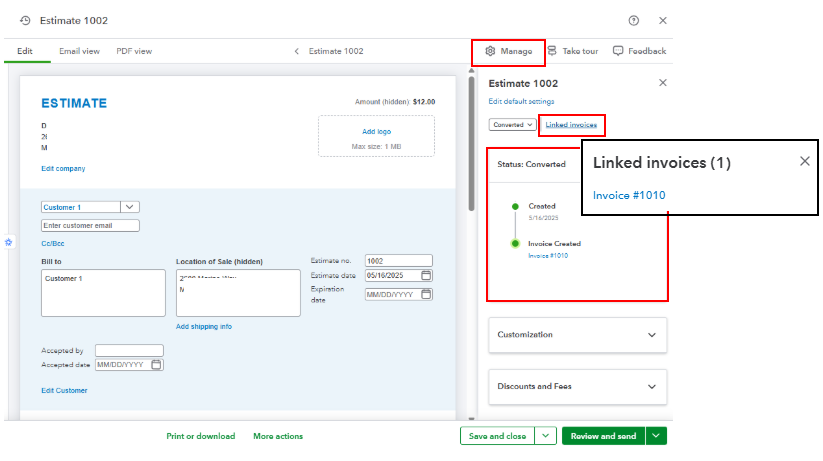 1. In your QuickBooks Online account, open the estimate you created.