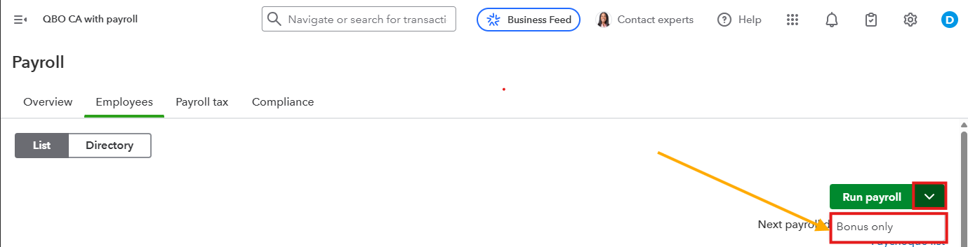 - Click the Run payroll drop-down arrow and choose Bonus only.
