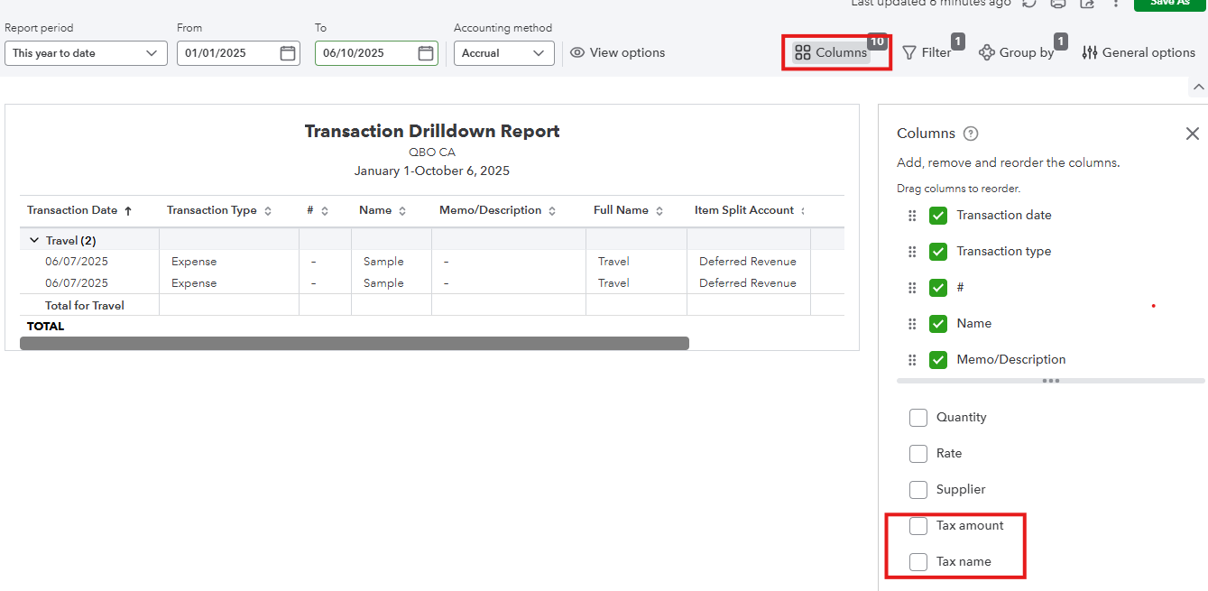 - Click the Columns button and the Tax amount and Tax name by ticking the check boxes.