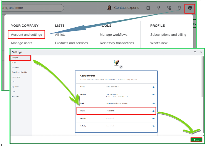 Let's start by verifying your company's contact information in your Accounts and settings. Additionally, ensure your invoice template is also set to display your phone number.
