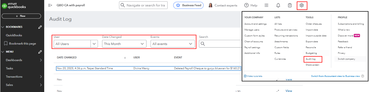 - In your QuickBooks Online account, navigate to Settings and select Audit Log.
