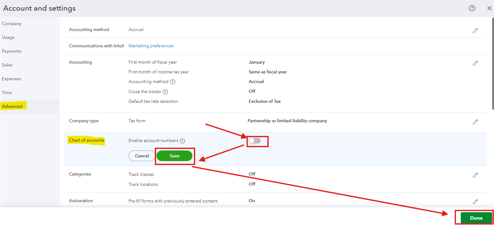 3. Click the Pencil icon to edit in the Chart of Accounts section.