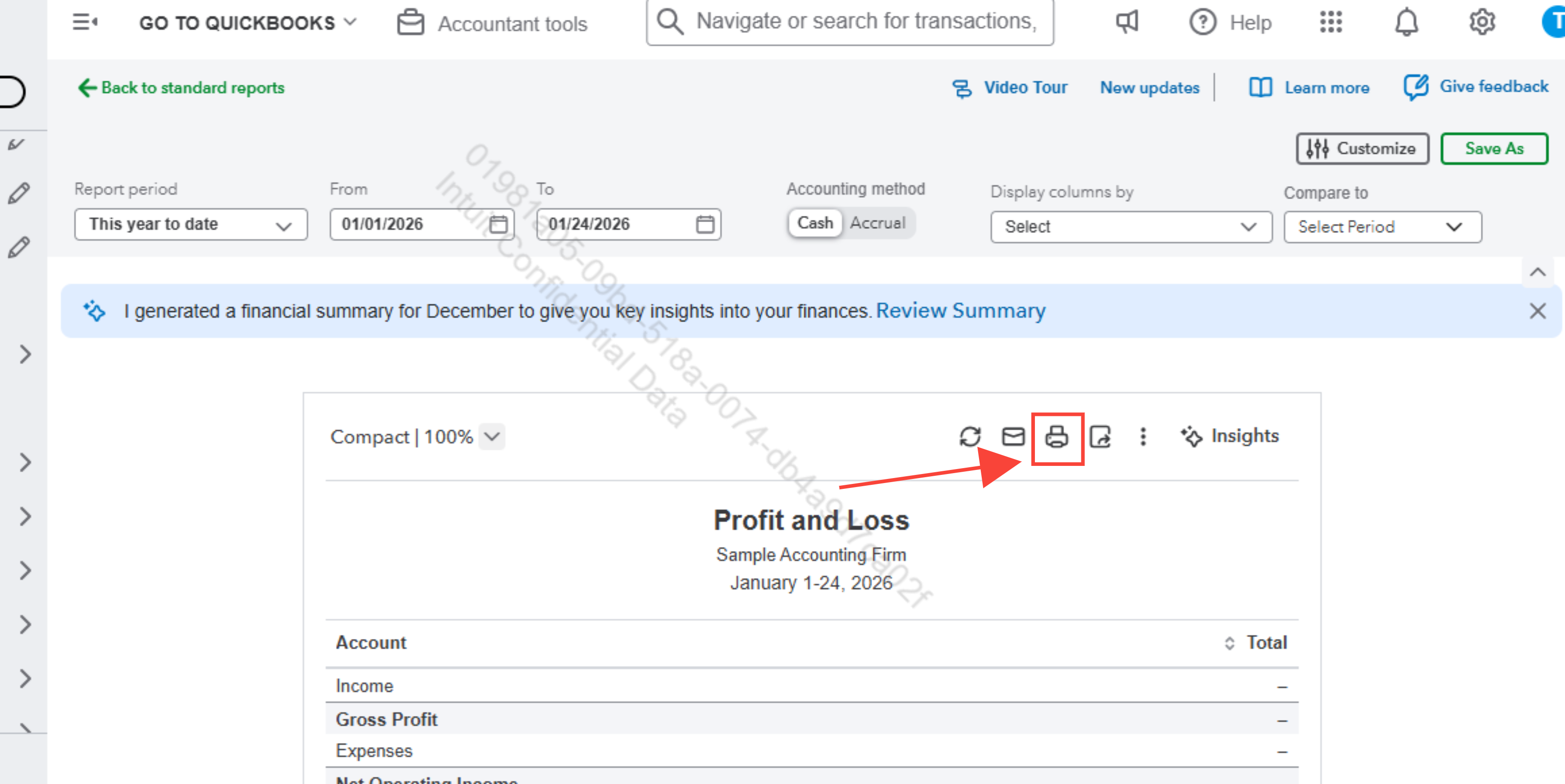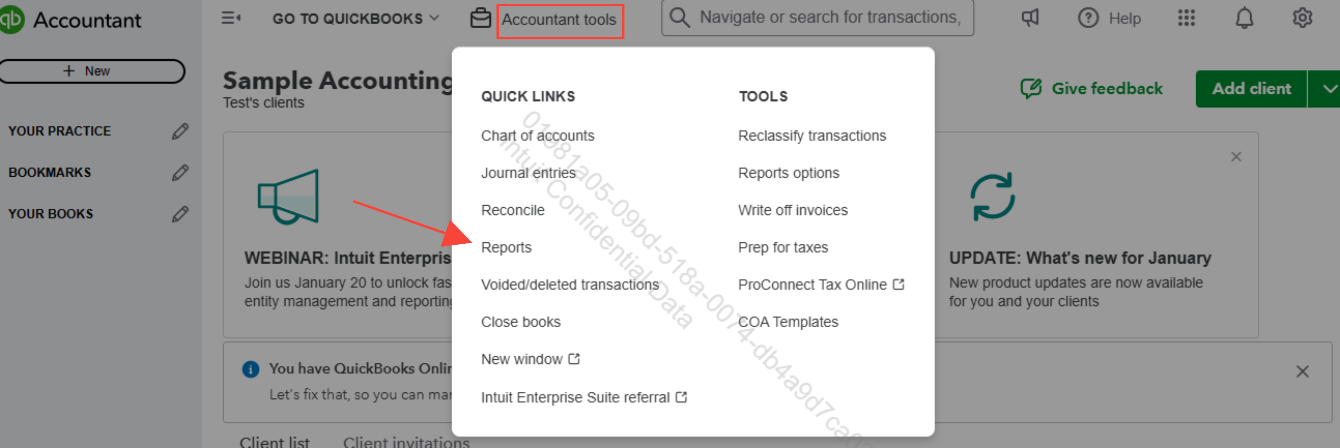 You can also access basic company financial reports by clicking Accountant Tools at the top and selecting Reports to open the full report center.