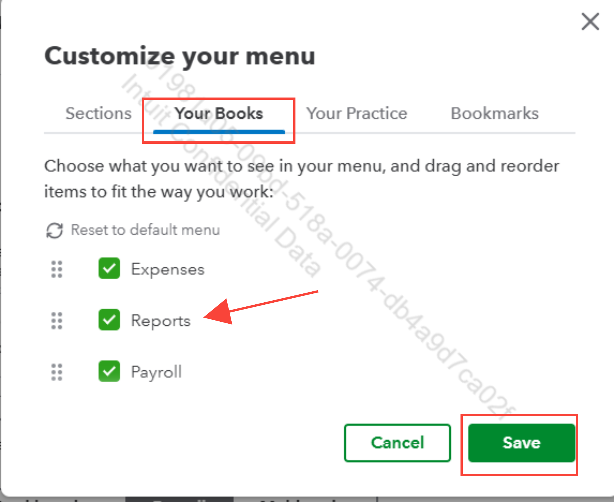 - Under Your Books, scroll to Reports and check the box to show it in the left menu.