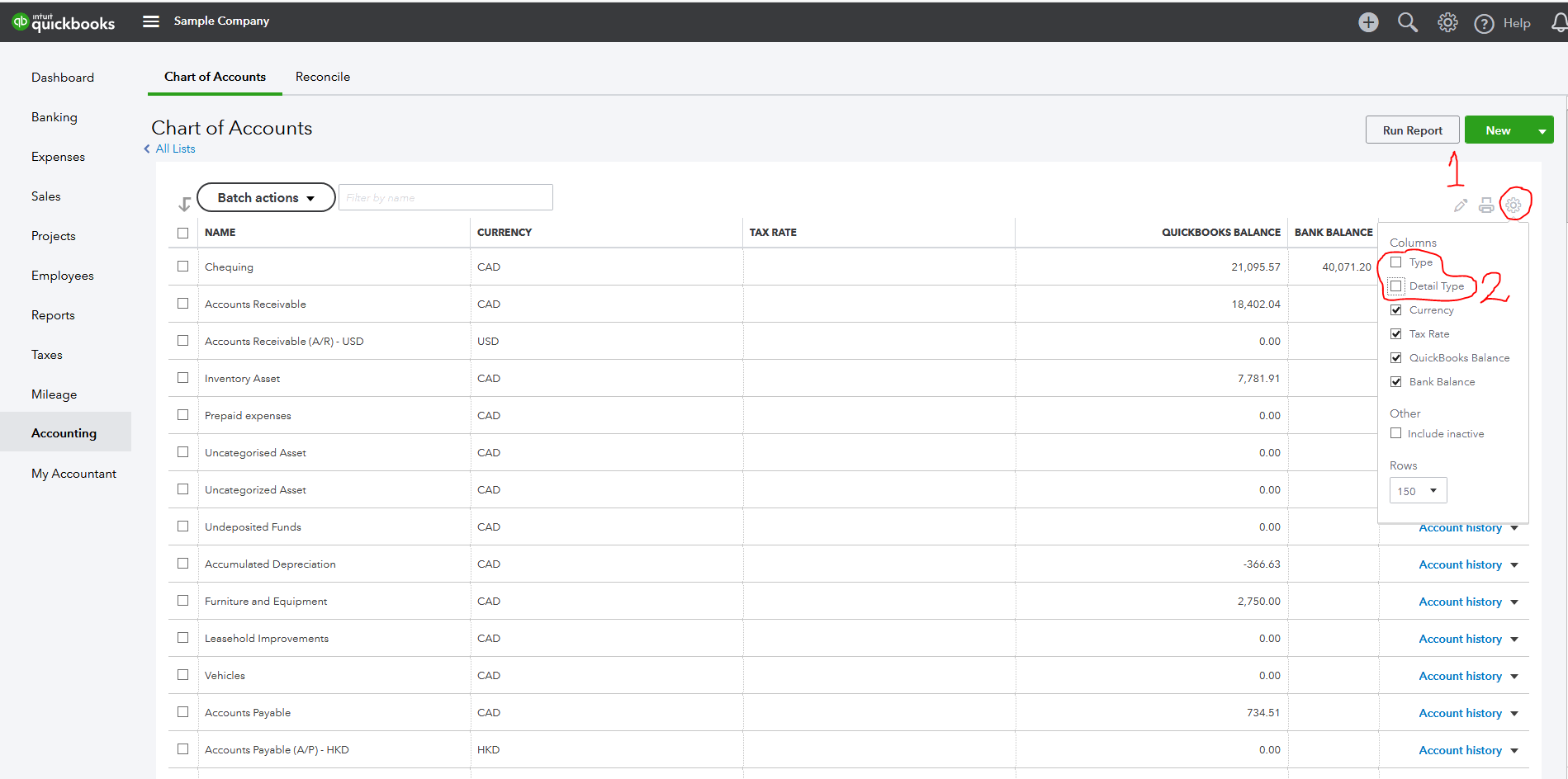 Based on your description, you'll have to filter out the Type and the Detail Type from the report in order to view the info you'd like to view. I'll show you how. From the left navigation menu, click Accounting > Chart of Accounts > Gear icon > uncheck Type and Detail Type. I'll attach a screenshot below for reference: