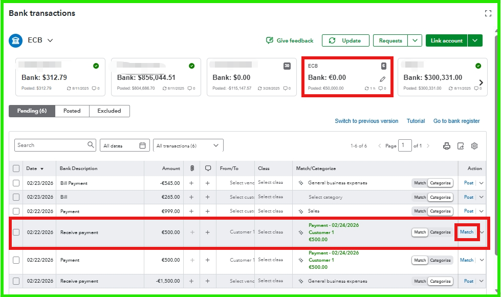 But both my bank account and the customer are in the same currency (Euro). How come it doesn’t work? I’m using the multicurrency feature, but my main QBO currency is USD.